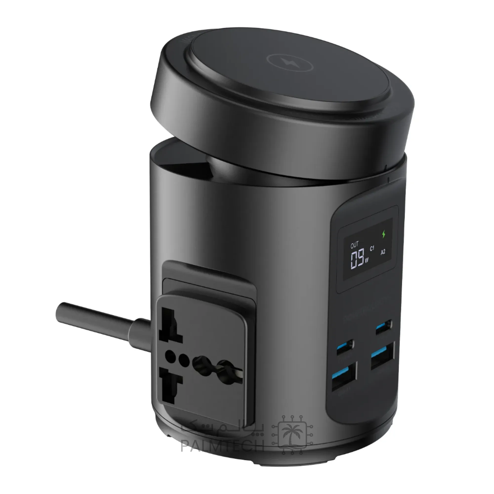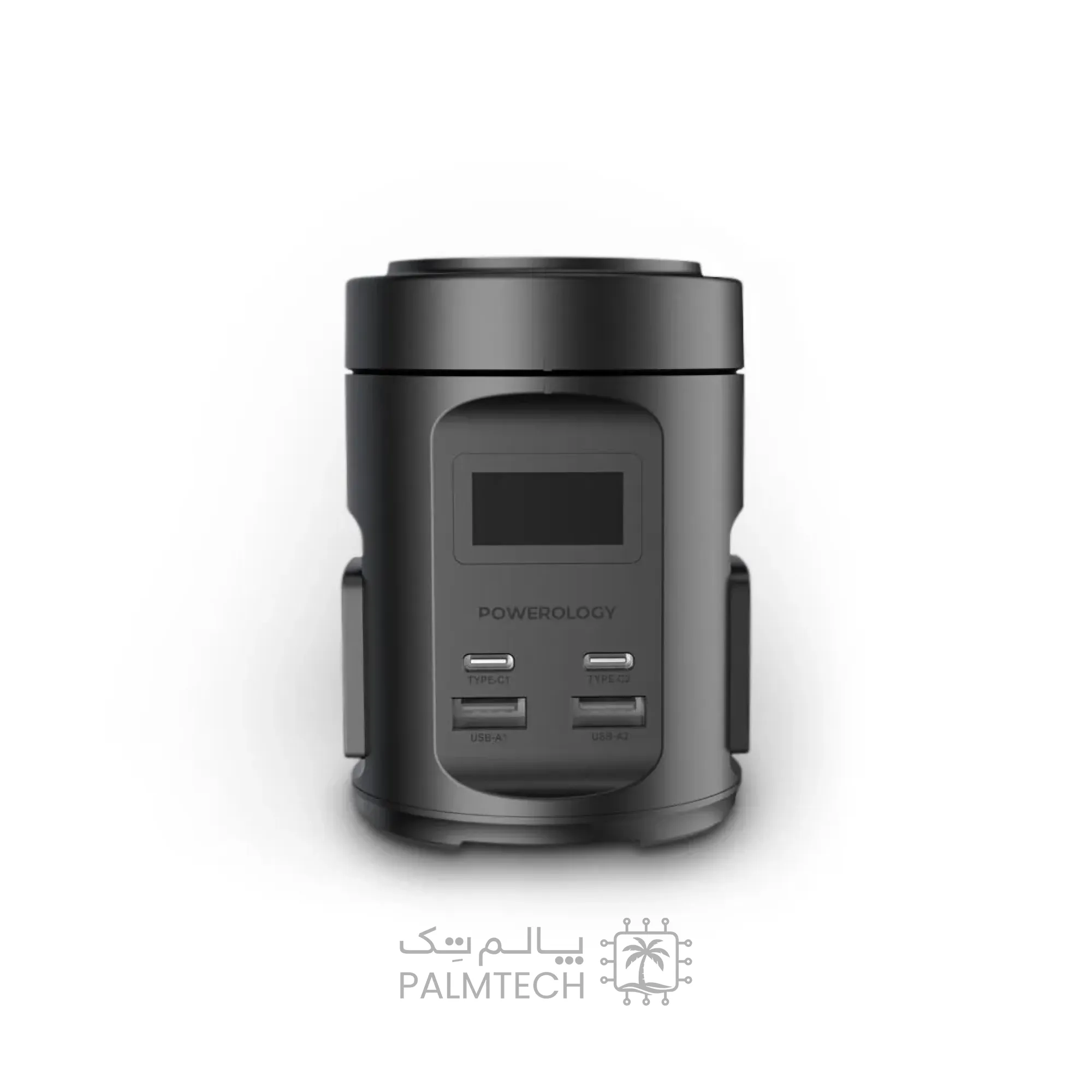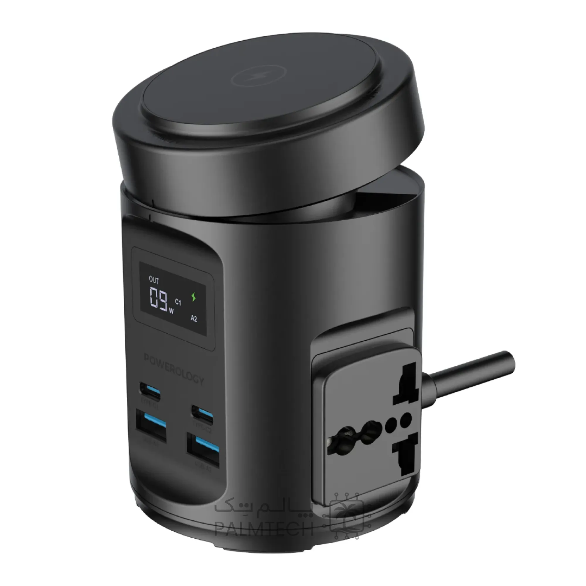 سیار Powerology PWCUQC014 یک ایستگاه شارژ چندمنظوره و جمعوجور است که ترکیبی از پریز برق و پورتهای شارژ مدرن را ارائه میدهد. دارای دو پورت USB‑C 65 وات PD، دو پورت USB‑A QC 3.0 و شارژر وایرلس MagSafe 15 وات برای شارژ همزمان گوشی، تبلت و لپتاپ است.