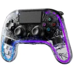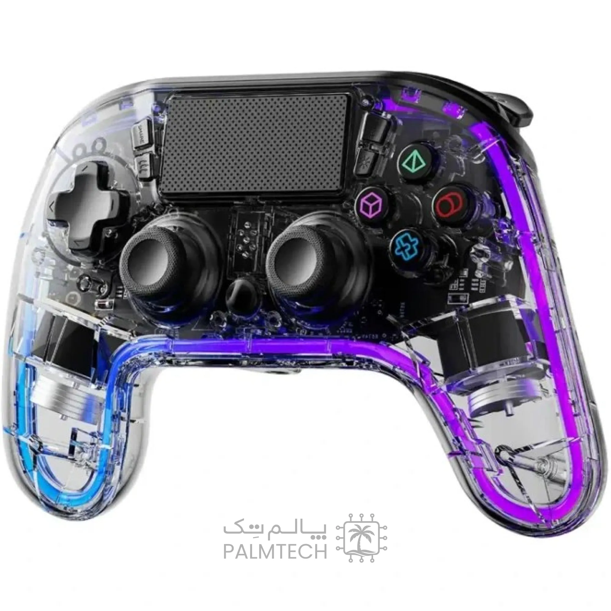 دسته بازی کریستالی پورودو با نور RGB، باتری ۹۰۰ میلی‌آمپری، لرزش، تاچ پد و قابلیت اتصال چندسکویی به PS4، PS3، PC، iOS و Android، مناسب تجربه حرفه‌ای بازی.